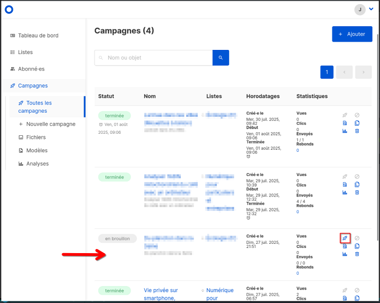 Tant qu’elle n’est pas finalisée, votre lettre d’information est en mode brouillon, et sera listée dans la liste des campagnes :