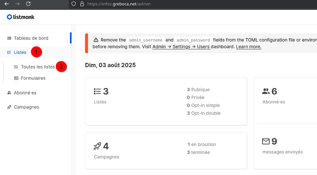 Si vous avez créé une nouvelle liste, elle n’apparaîtra pas !. Contactez-nous, et indiquez-nous le nom ou l’identifiant de la liste que vous venez de créer, pour que l’on puisse vous octroyer les droits de gestions dessus.