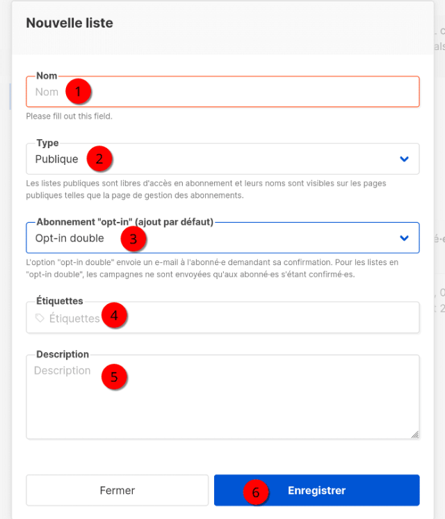 — Avec le double opt-in, l’abonné recevra un email de notification, mais devra confirmer son abonnement. - Les étiquettes sont des mots-clefs que vous pouvez associer à votre liste, nécessaire uniquement pour une utilisation avancée du logiciel