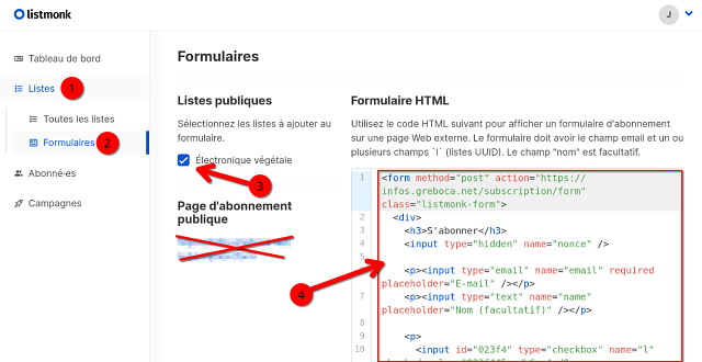 — public : L’inscription sera ouverte publiquement via un formulaire, à afficher sur un site Internet (nous verrons en détail plus loin ce point) - Le mode d’abonnement ’opt-in’ :